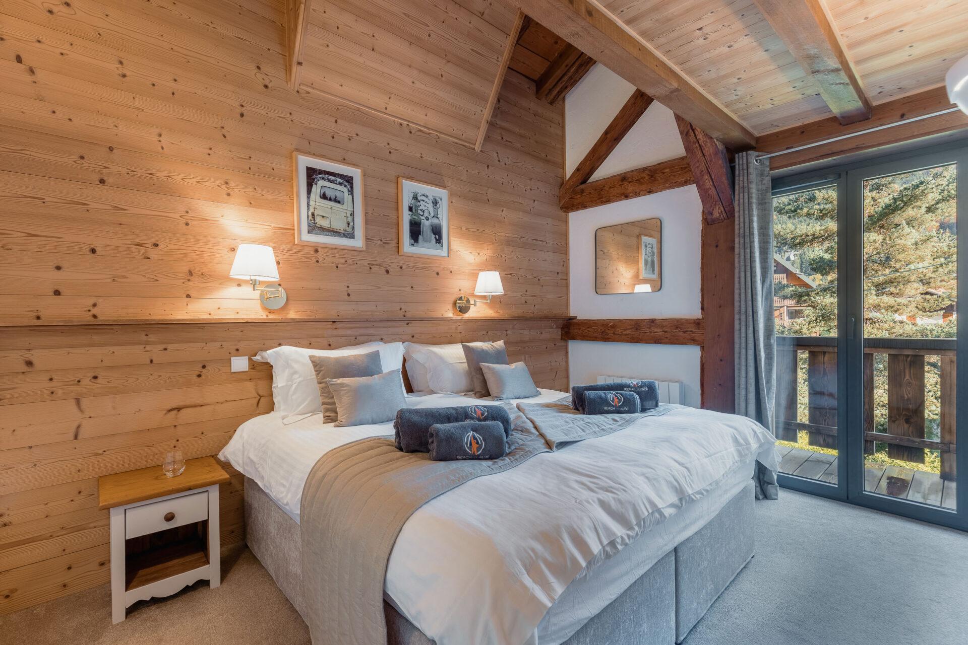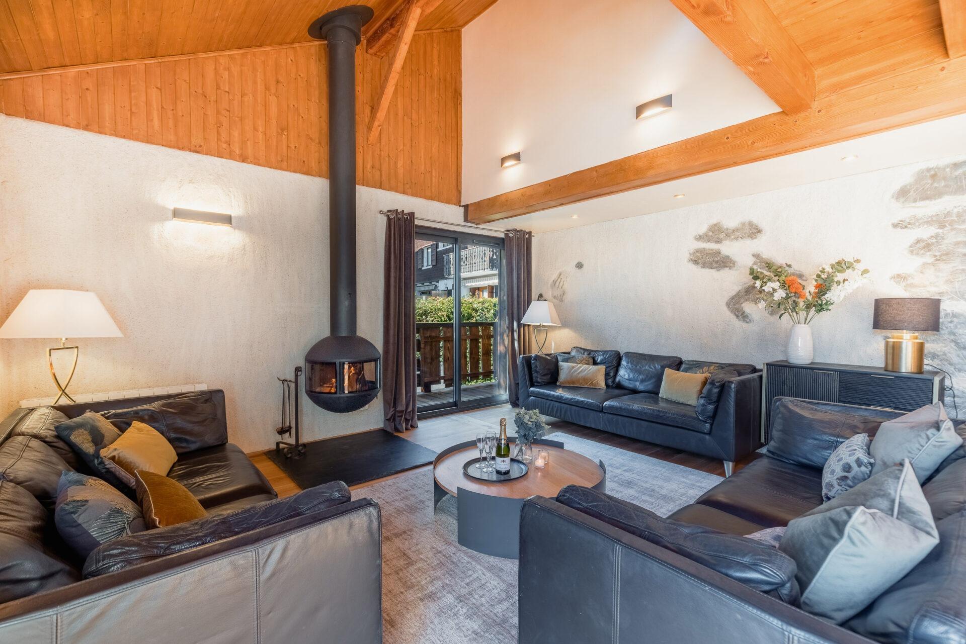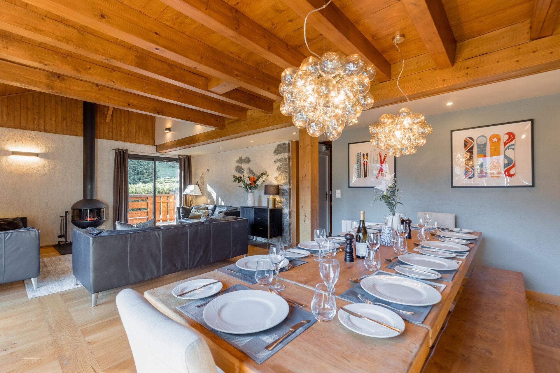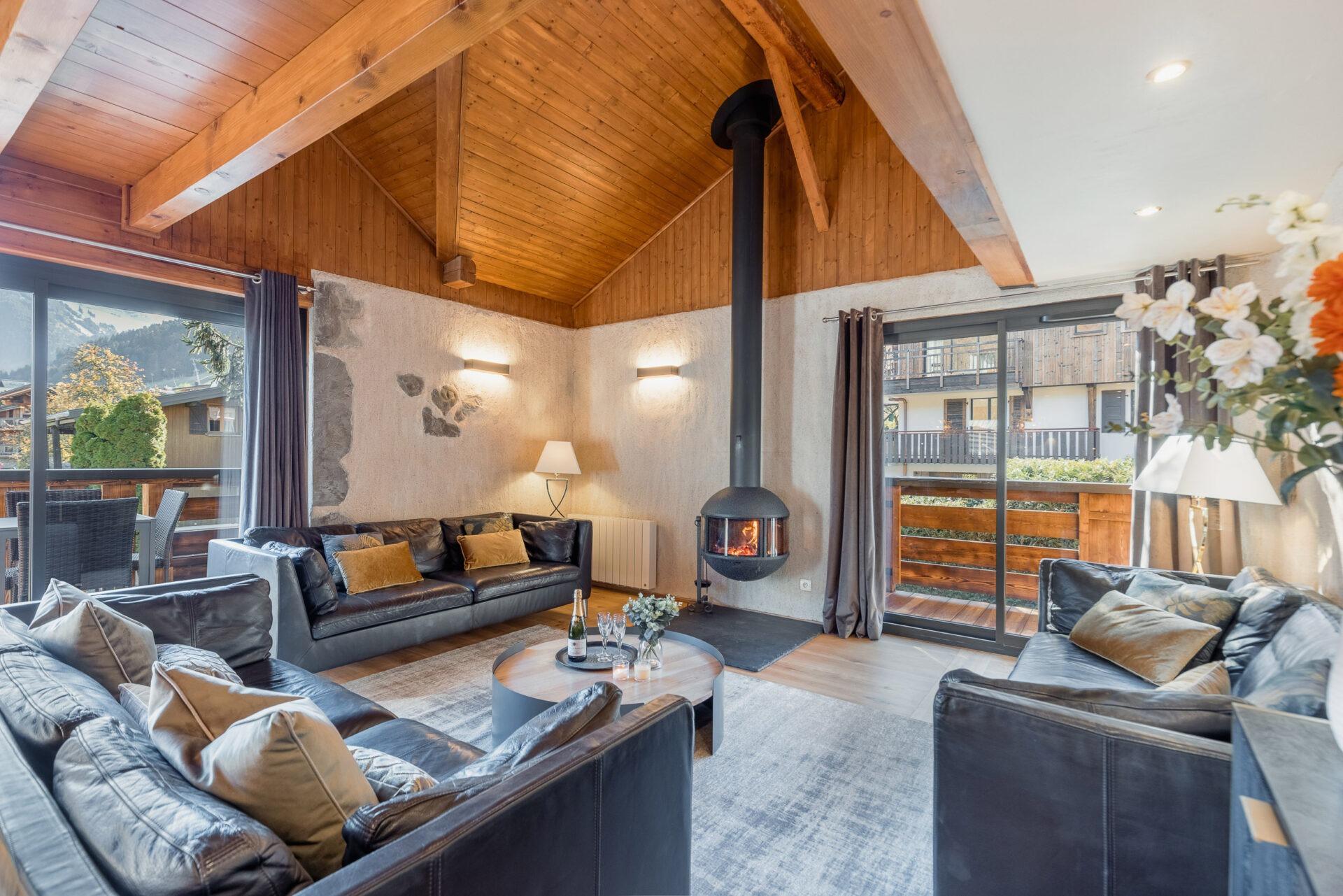 Chalet Aux Joux combines rustic charm with modern amenities, offering a serene retreat for up to 13 guests. The chalet features original wooden beams and a modern open-plan living area with a suspended log burner, where guests can enjoy sweeping views of Morzine’s peaks from the large balcony.