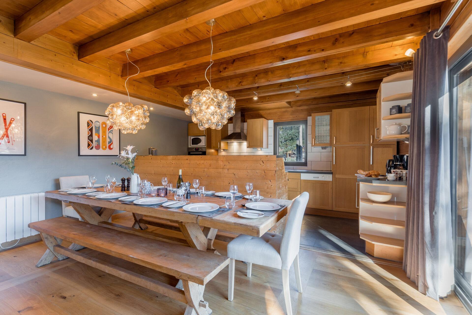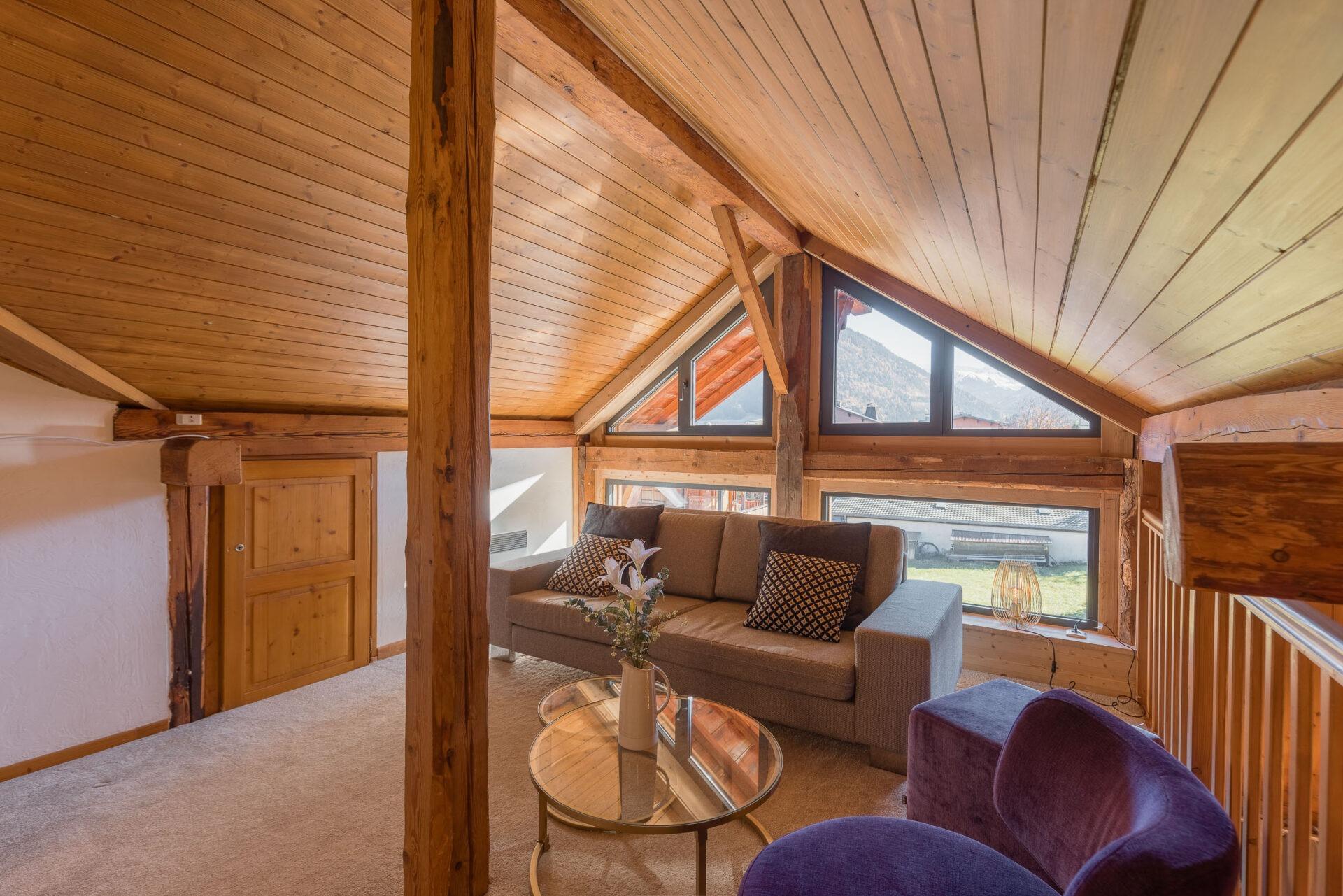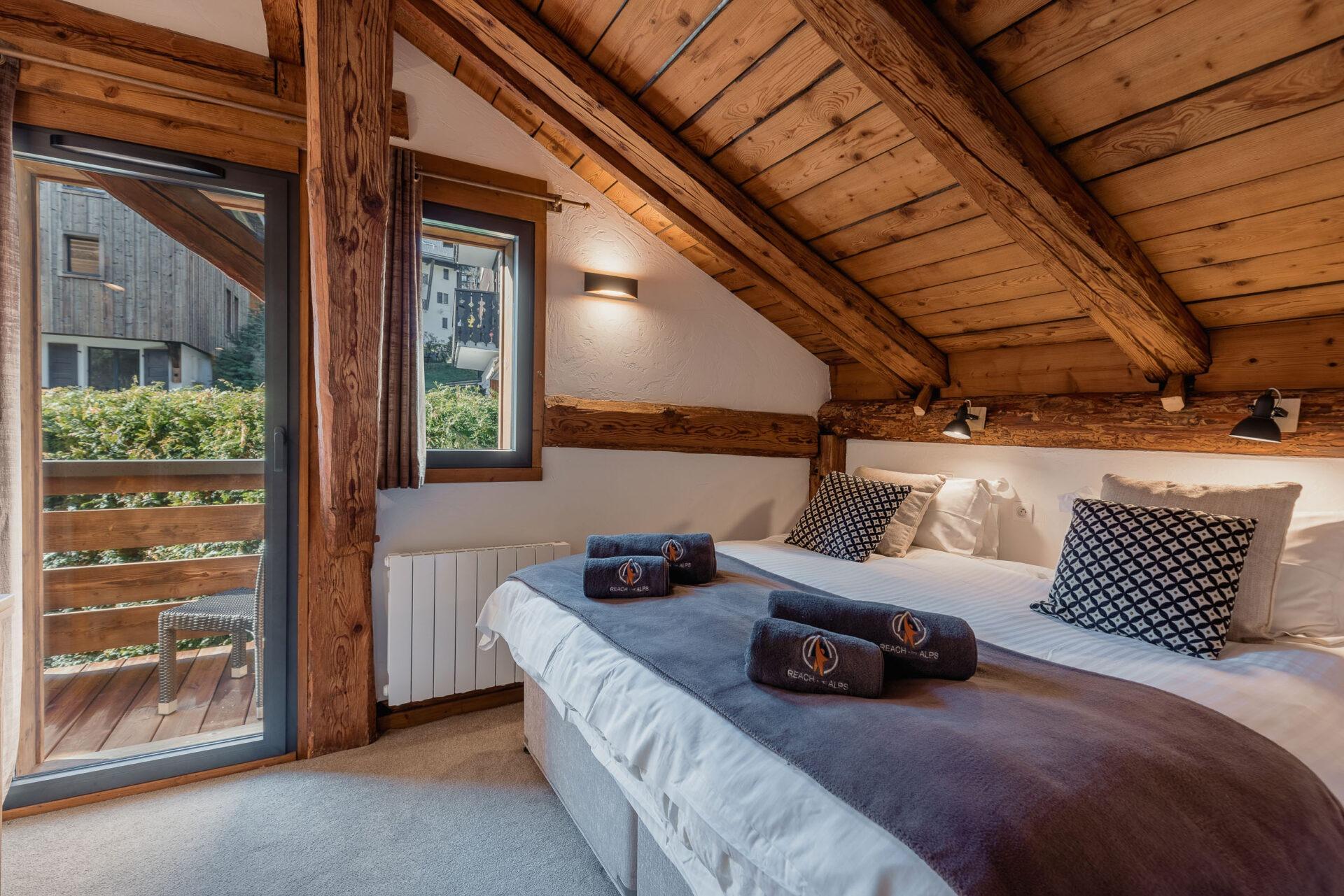 Chalet Aux Joux combines rustic charm with modern amenities, offering a serene retreat for up to 13 guests. The chalet features original wooden beams and a modern open-plan living area with a suspended log burner, where guests can enjoy sweeping views of Morzine’s peaks from the large balcony.