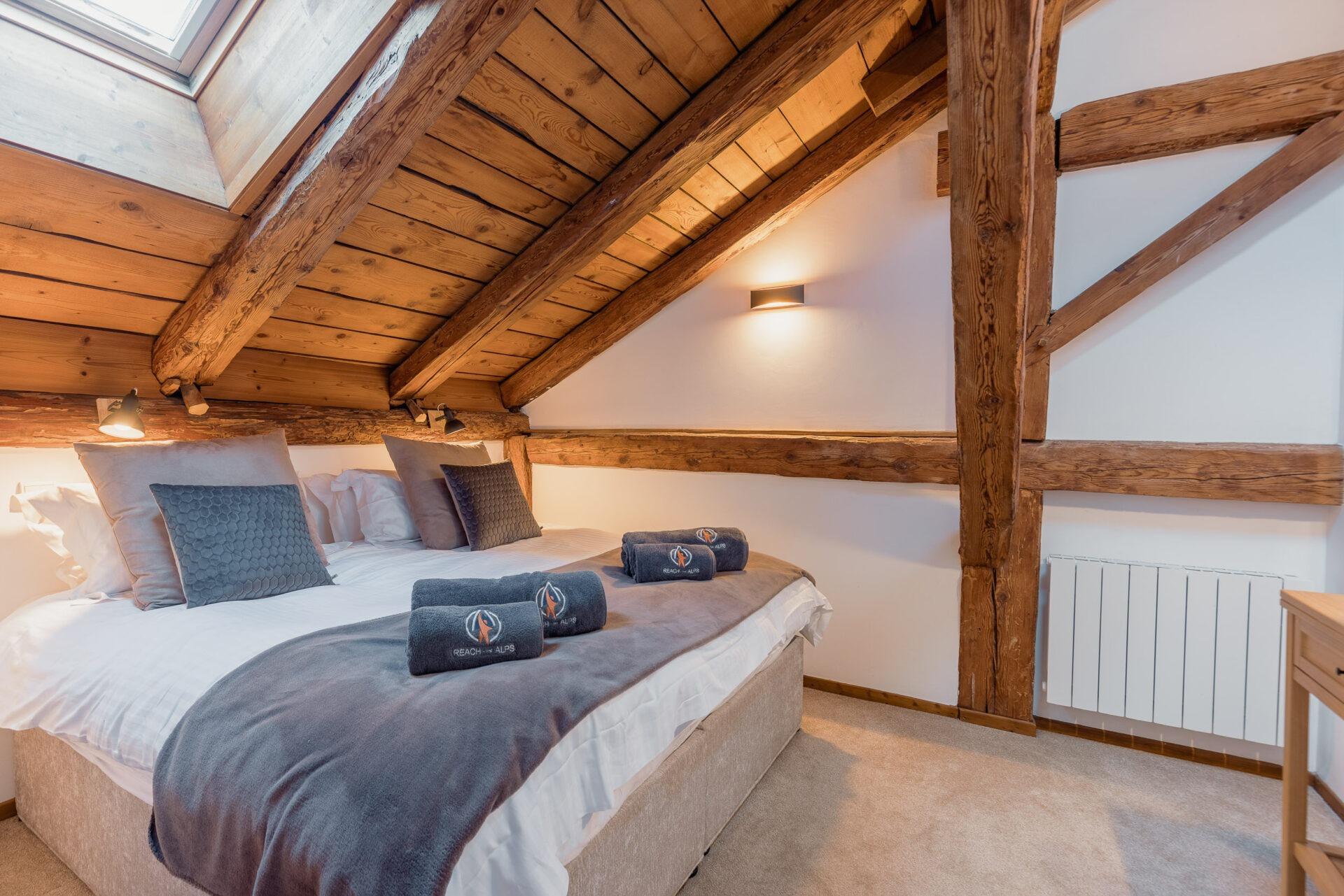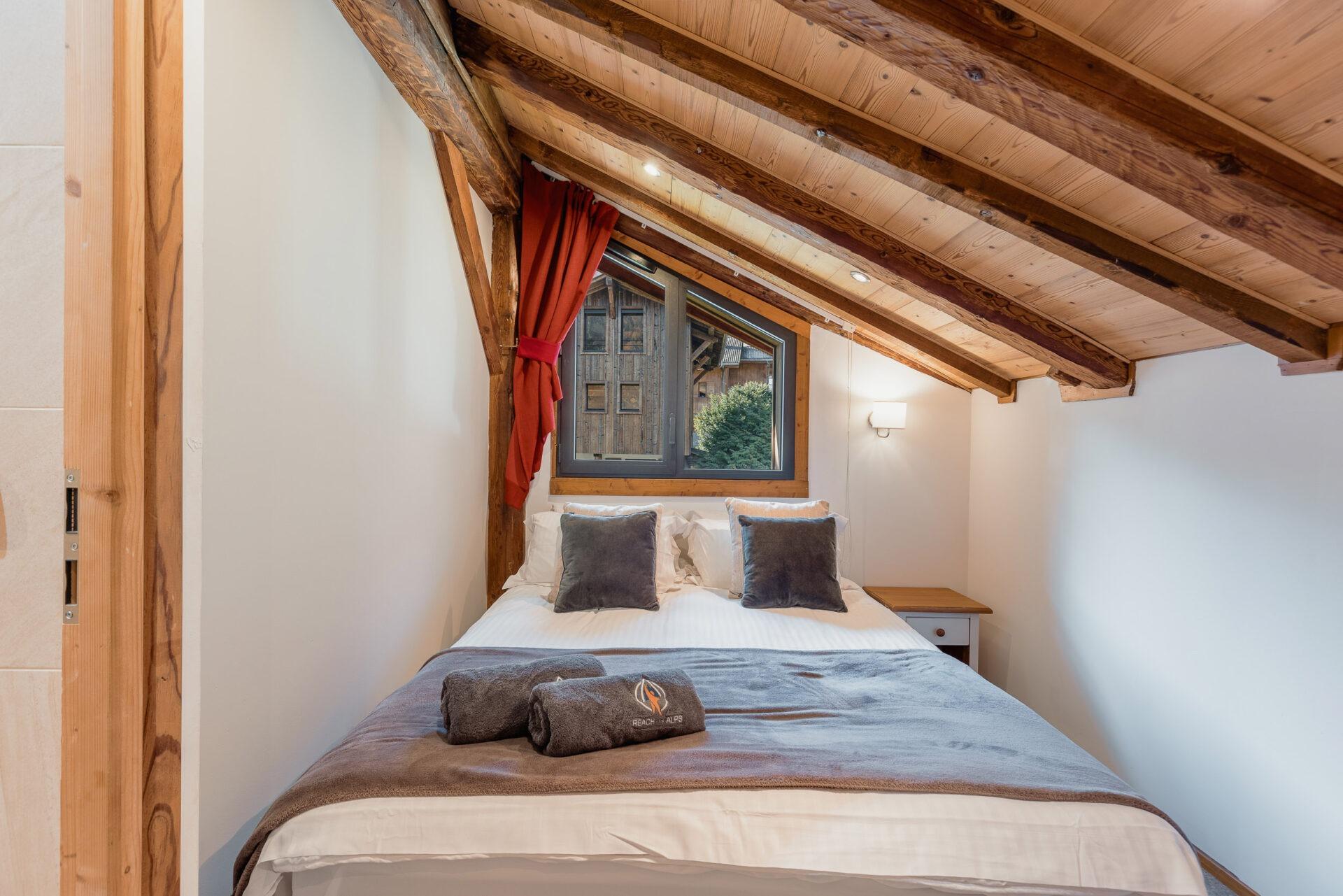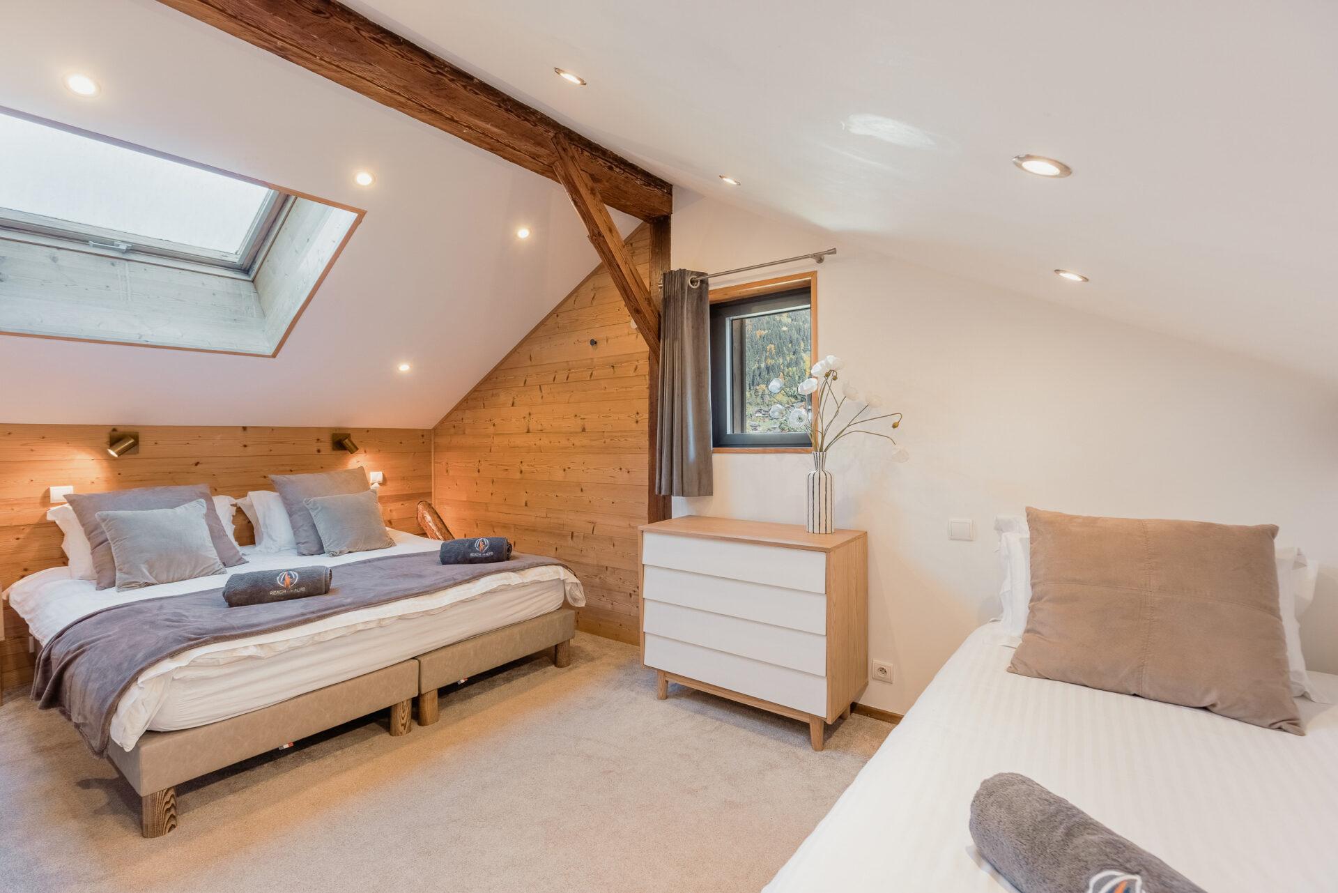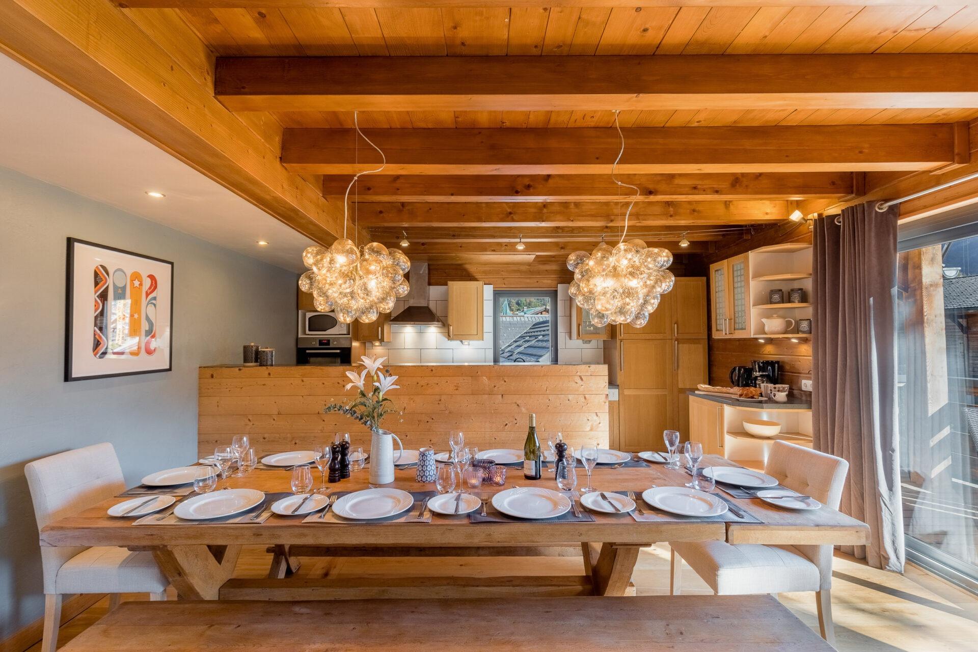 Chalet Aux Joux combines rustic charm with modern amenities, offering a serene retreat for up to 13 guests. The chalet features original wooden beams and a modern open-plan living area with a suspended log burner, where guests can enjoy sweeping views of Morzine’s peaks from the large balcony.