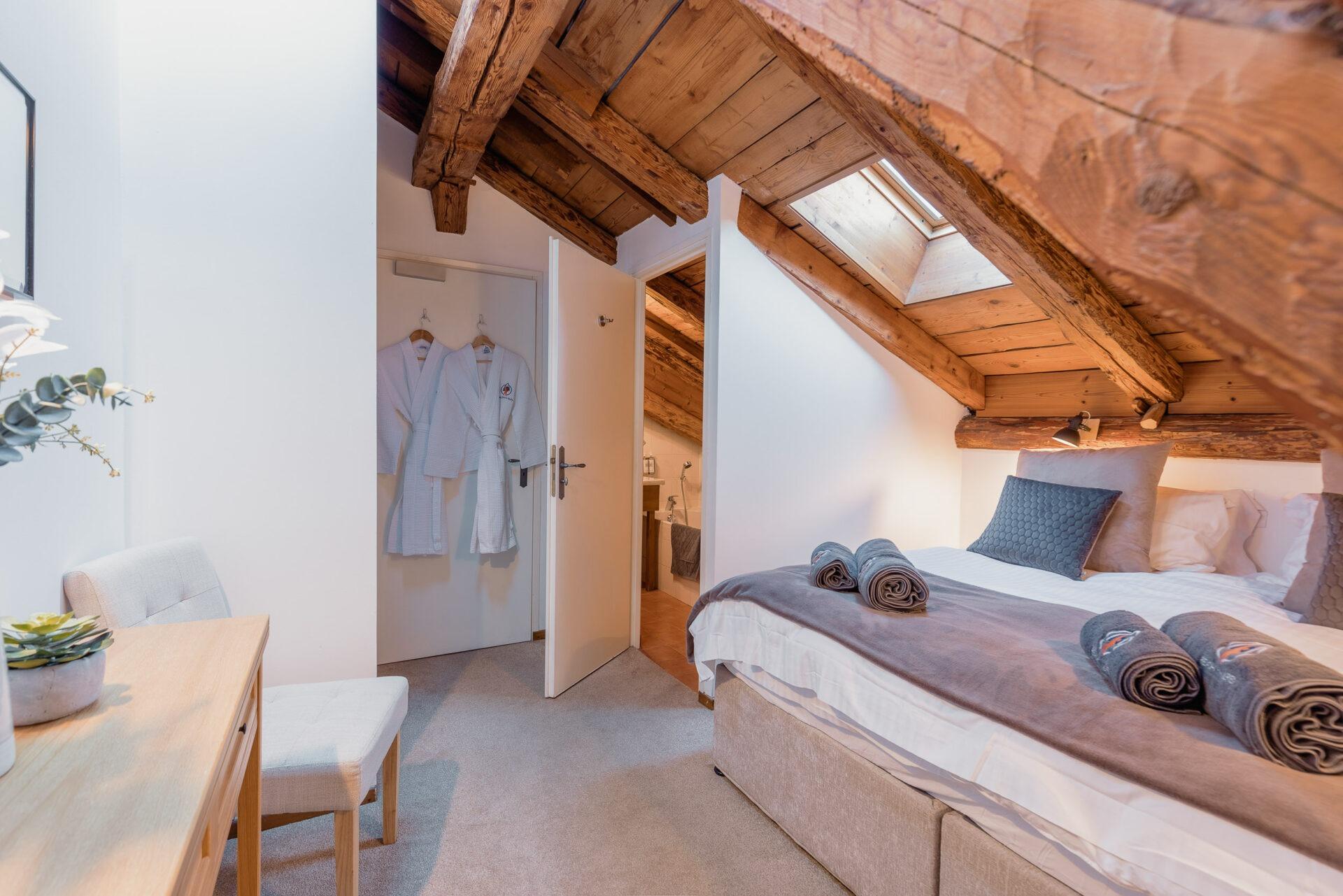 This chalet has 4 rooms with ensuite shower rooms and 2 bedrooms with ensuite bathrooms plus an additional shower room downstairs. With an outdoor hot tub and a barrel sauna, it provides comfort and luxury. Located just a short walk from the town centre and main lifts, its peaceful yet convenient location makes it an ideal choice for a memorable winter holiday in the Alps.